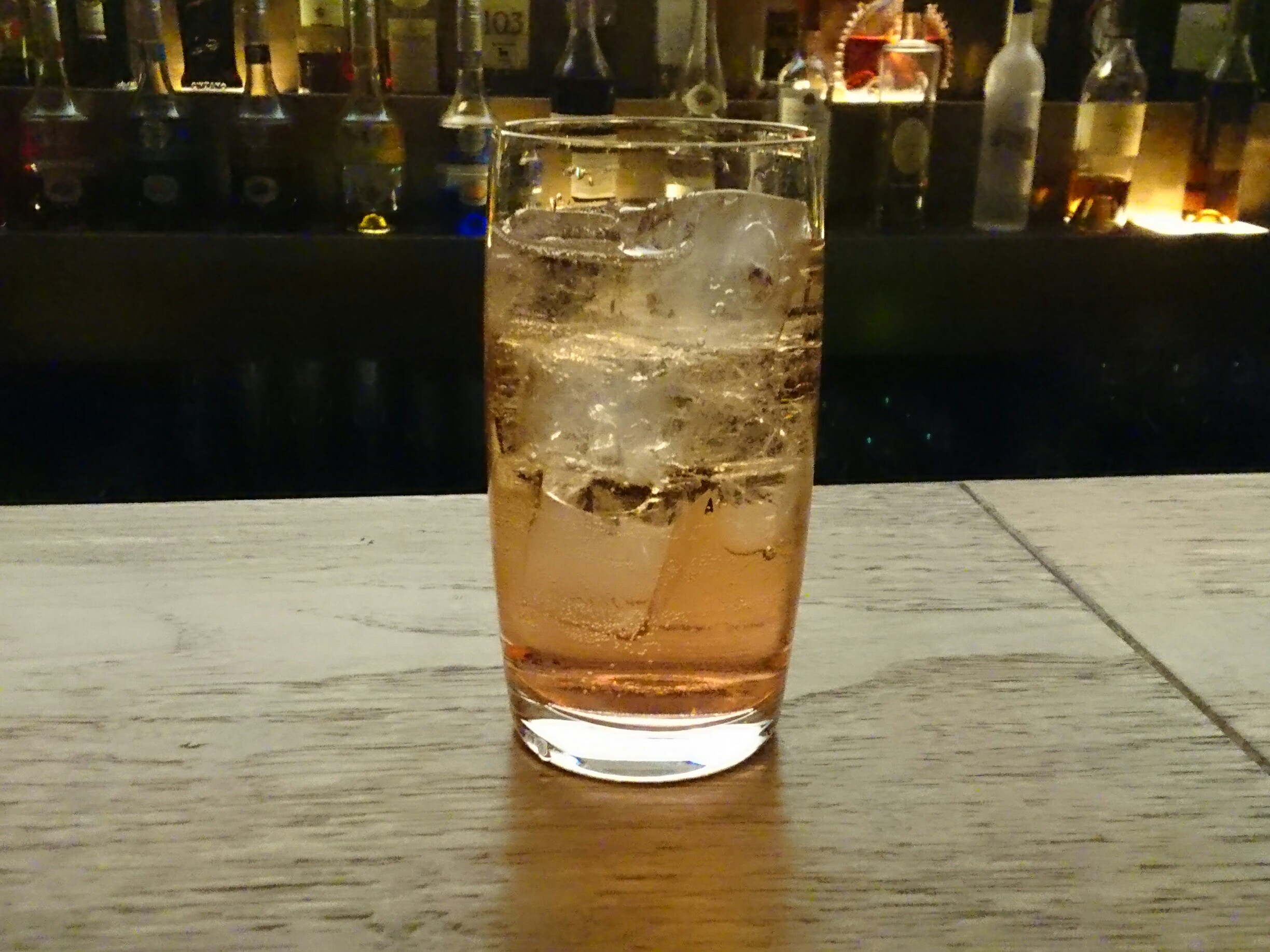 営業前の一杯、今回は、カナディアンクラブと桜リキュールとトニックウォーターの