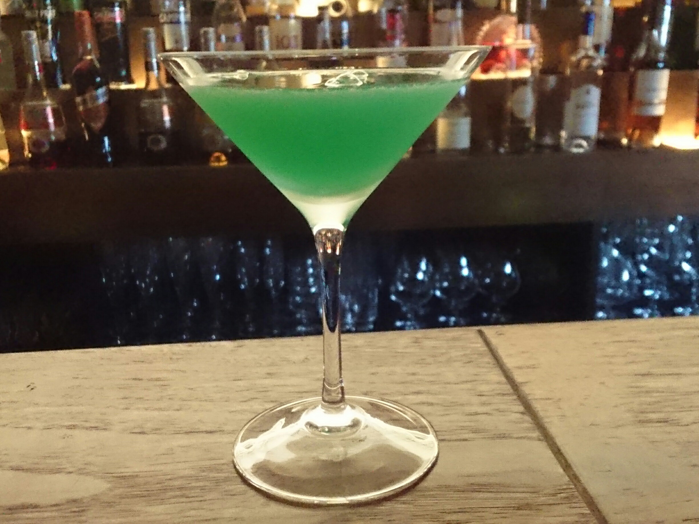 エメラルドグリーンの色合いがとても映えるカクテルです。